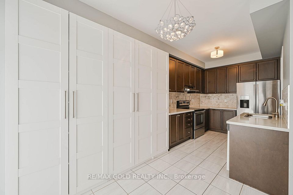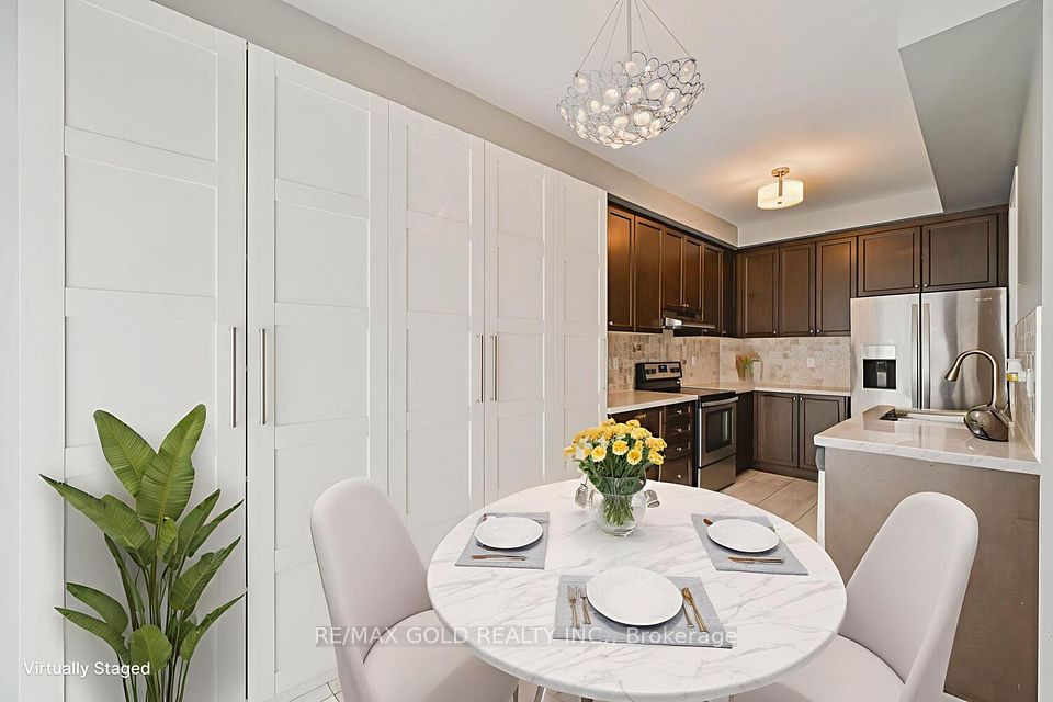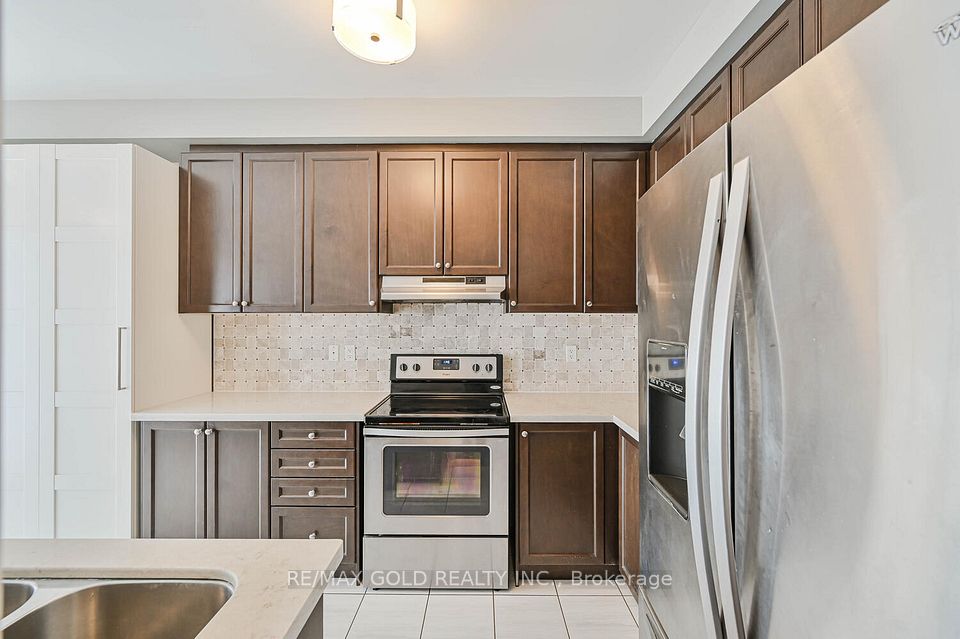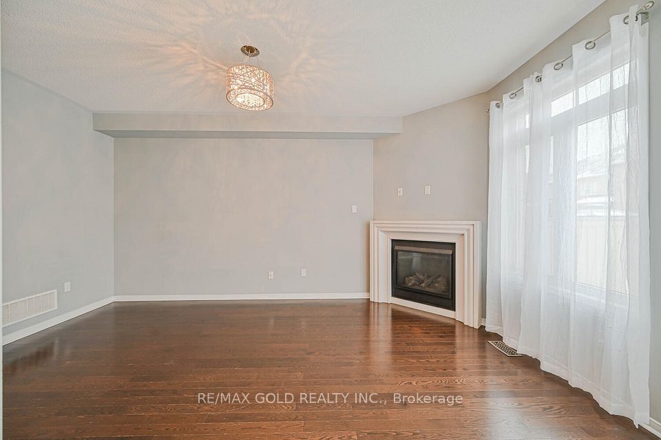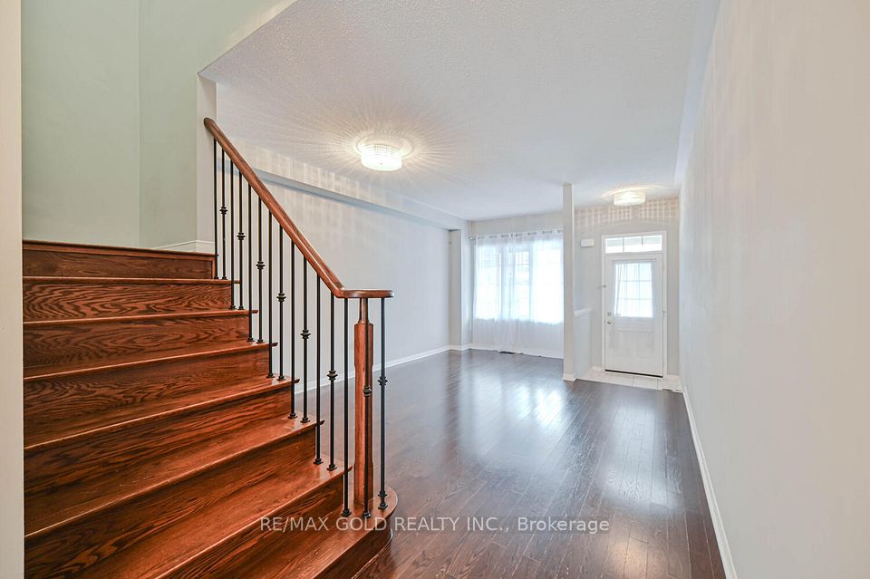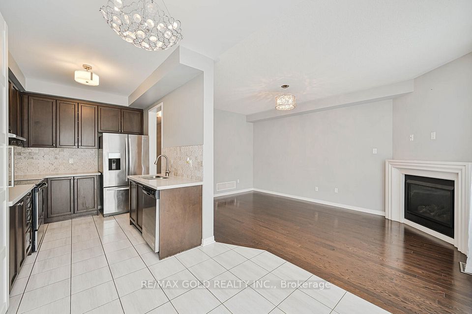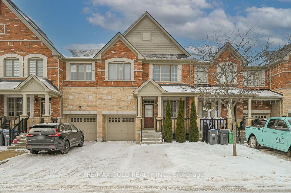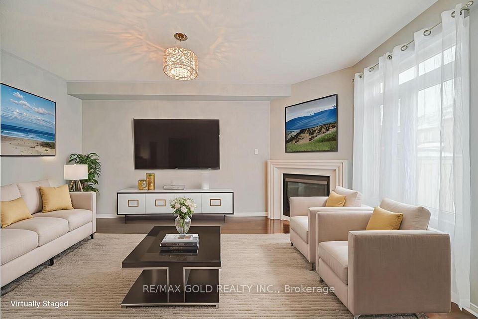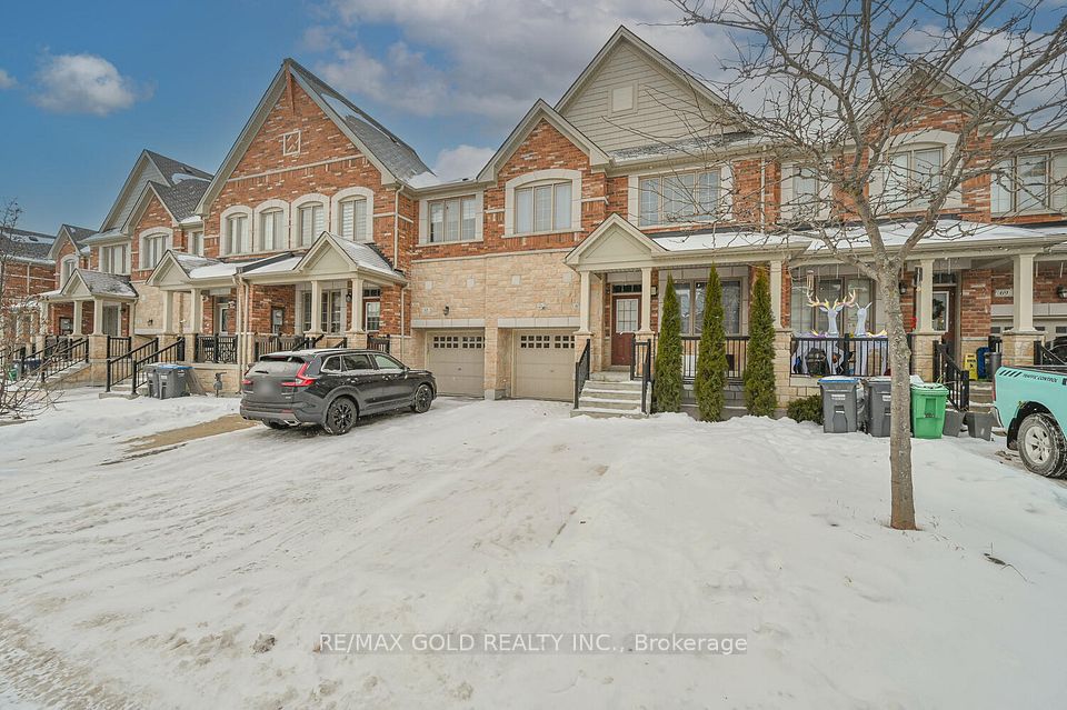 Welcome to this beautifully designed freehold townhouse offering over 2,100+ sq ft of stylish living space, featuring an elegant layout with separate living, dining, and family rooms with a cozy fireplace, 9-ft ceilings, hardwood floors, and a striking oak staircase with iron pickets. The chef-inspired kitchen boasts quartz countertops, custom cabinetry with pantry, and a sleek tile backsplash, ideal for everyday living and entertaining. Upstairs offers 4 generously sized bedrooms, including a primary suite with walk-in closet and private ensuite, along with convenient second-floor laundry and custom closet organizers throughout. The single-car garage includes a mezzanine for extra storage, and the extended driveway fits up to 3 additional vehicles. Located in a family-friendly neighborhood close to parks, schools, shopping, Trinity Commons, Hwy 410, and all essential amenities-this home is a perfect blend of space, comfort, and modern living.