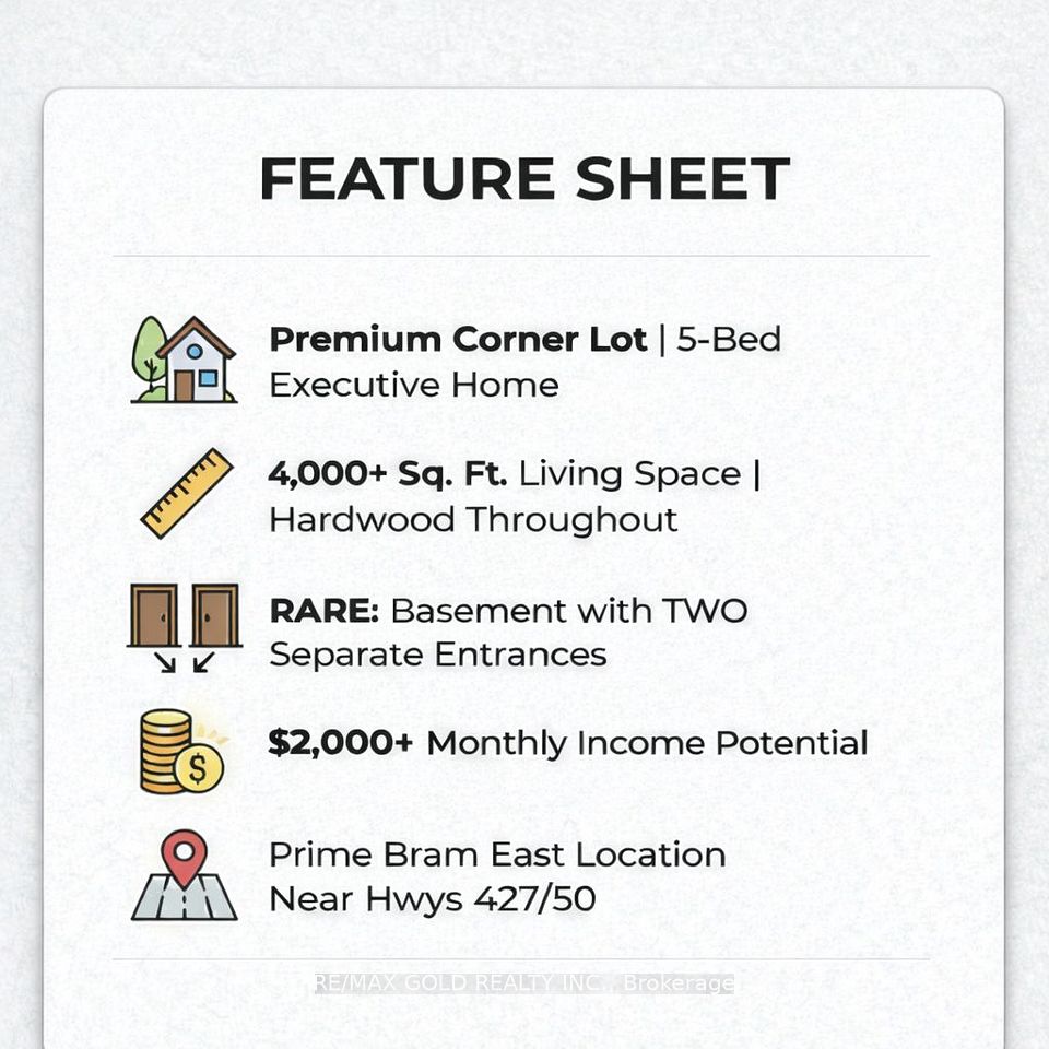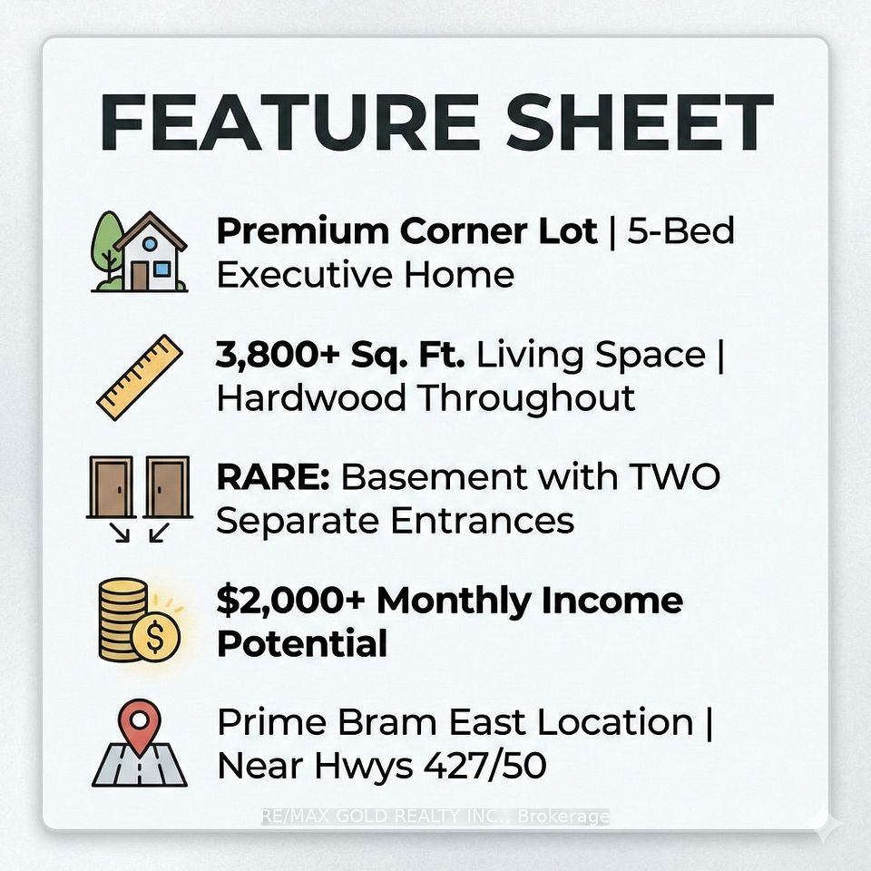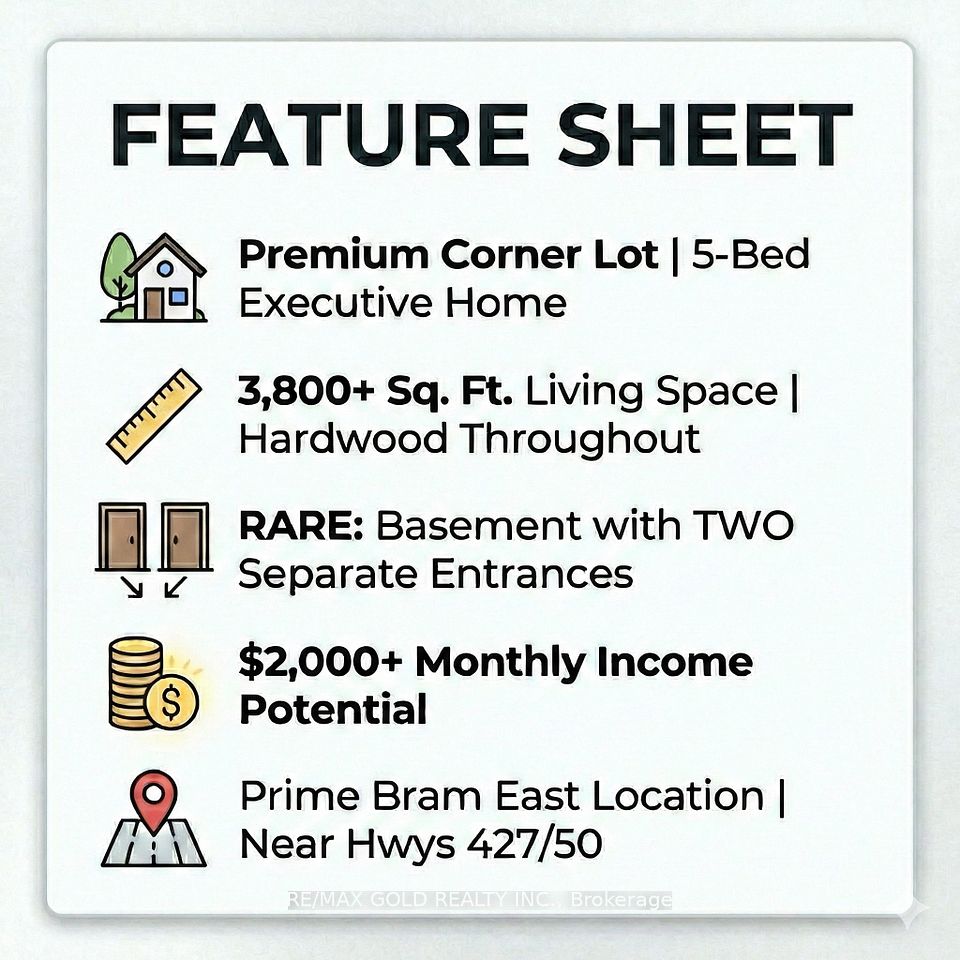 Stunning 5-Bed home with 4000+ sqft of Living space with Rare Income Potential in Bram East Castlemore Area !Experience the sun-filled luxury in this executive detached home. Features gleaming hardwood floors throughout, a modern open-concept kitchen with breakfast area, and spacious principal rooms. Situated in a prime location minutes from Hwy 427/50, top-rated schools, and walking trails. THE GAME CHANGER: A fully finished basement with TWO separate entrances and full kitchen. Unmatched flexibility to keep one side for private use and rent the other, or lease the entire unit for $2,000+/mo potential income. Ideal for multi-generational families or investors seeking serious cash flow to offset the mortgage. Don't miss this opportunity!